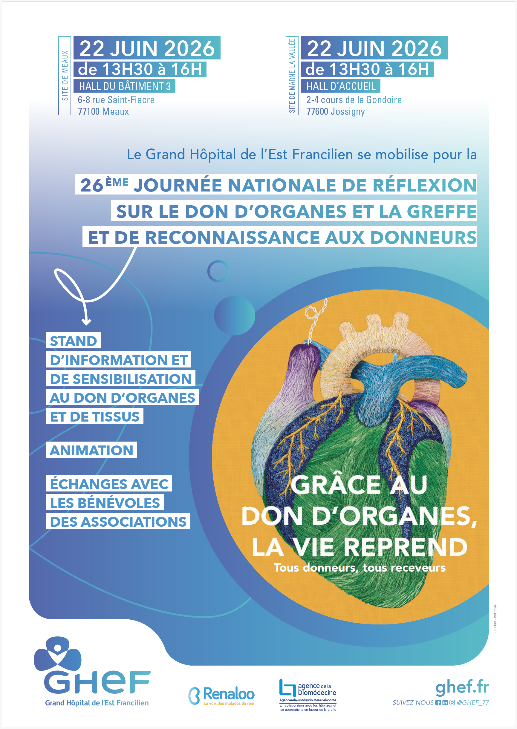 Dans le cadre de la 26ème Journée nationale de Réflexion sur le Don d'Organes et de la Greffe et de Reconnaissance aux Donneurs, le GHEF se mobilise...